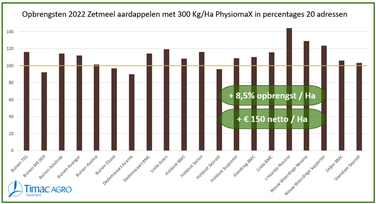 Enter Title PhysiomaX PhysiomaX is een wortelhaar stimulerende calcium. Op basis van jonge zeekalk die in tegenstelling tot bovengronds gewonnen kalkmeststoffen (dolomiet), niet gecompacteerd en gefossiliseerd is en daarom nog rijk aan sporenelementen. PhysiomaX bevat plantbeschikbare calcium uitgerust met biostimulant Physio+ voor een verbeterde beworteling van gewassen. Text/HTML Kenmerken PhysiomaX: Biostimulant Physio+ (aminopurine) bevordert wortelhaarontwikkeling Hoge interne porositeit en groot contactoppervlak met bodemzuren en beworteling Voorjaarstoepassing, directe werking bij de groei/kieming Snelle levering van plantbeschikbare calcium Inbreng van belangrijke sporenelementen Text/HTML PhysiomaX in zetmeelaardappelen: méér tonnen en méér knollen PhysiomaX in de zetmeelteelt zorgt voor : Snel plant beschikbaar Calcium voor een sterker gewas Betere opname van elementen door biostimulant Physio Pro Inbreng van belangrijke sporenelementen Hieronder ziet u een overzicht van de proefresultaten van PhysiomaX in zetmeelaardappelen: Bron: Timac Agro 2022 Door de inzet van PhysiomaX realiseert u: Een hogere opbrengst en meer knollen ( + 8,5% opbrengst /Ha) Een betere kwaliteit Een actief wortelgestel, waardoor vocht en bodemelementen beter worden opgenomen Advies: 300 kg/ha in het voorjaar strooien voor het poten PhysiomaX Aardappelen PhysiomaX Aardappelen Dowload hier meer informatie over de inzet van PhysiomaX in de teelt van zetmeelaardappelen Meer informatie over PhysiomaX in aardappelen Text/HTML PhysiomaX in grasland Door het toepassen van PhysiomaX in grasland neemt het wortelgestel toe. Door extra opnamewortels kan gras méér mineralen uit de bodem opnemen en zo efficiënter groeien. Daarnaast is een hoge calciumbeschikbaarheid voor gras van essentieel belang voor stevige celwanden, (weerbaarheid en structuur) en een vlotte jeugdgroei voor de eerste snede. Voordelen PhysiomaX in grasland: Snellere beginontwikkeling in het voorjaar Hoger eiwit gehalte hoger VEM gehalte Advies: 300 kg/ha PhysiomaX, voor de 1e snede en voor de 1e bemesting met drijfmest. PhysiomaX grasland PhysiomaX grasland Dowload hier meer informatie over de inzet van PhysiomaX in grasland Meer informatie over PhysiomaX in grasland